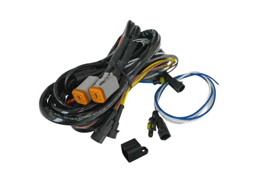 Med to 6-polede DT-kontakter kan du enkelt koble til ekstralys med høy effekt. Kabelsettet håndterer opptil 2 × 156 W med DT-kontakter, eller 2 × 240 W uten DT, noe som gjør det godt egnet for kraftige lysoppsett.